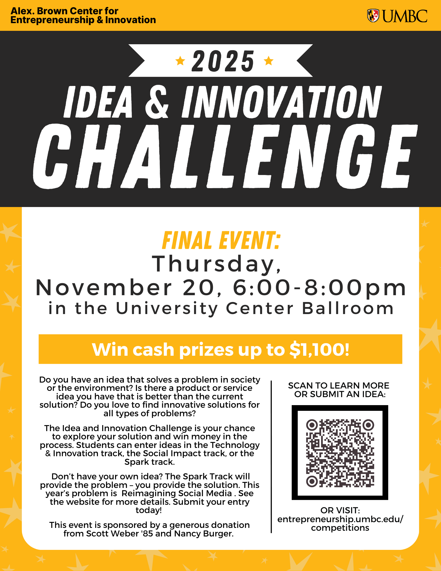 Alex. Brown Center For Entrepreneurship and Innovation will be hosting a COMPETITION called the Idea and Innovation Challenge! This year, the competition will feature 3 tracks: The Technology & Innovation Track, the Social Impact Track, and the Spark Track. The Spark Track will be an opportunity for students who don’t have their own idea to work on a solution to a problem that will be announced in advance. This year's challenge is Reimagining Social Media for Good. For more details go to our website!