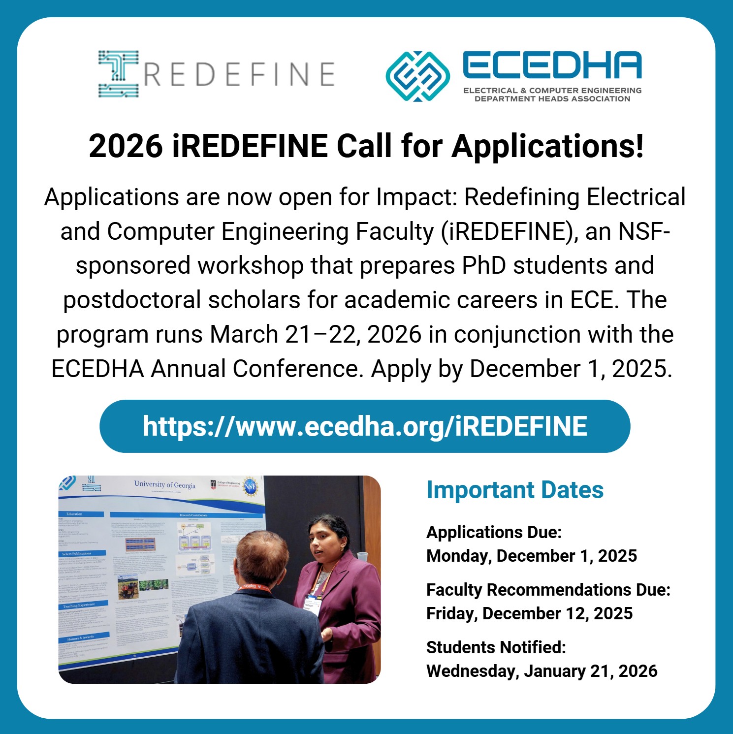 Join iREDEFINE‑26, an NSF-sponsored workshop designed to help you explore and prepare for faculty careers in ECE. The event runs March 21-22, 2026 at the Hyatt Regency Tamaya Resort & Spa in Santa Ana Pueblo, New Mexico.