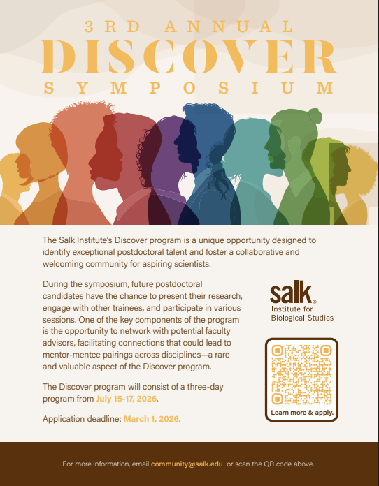 1) The Discover Symposium is open to current PhD students who are 1-2 years from beginning their postdoctoral position and invites candidates to an exclusive, immersive experience designed to ignite collaboration and accelerate careers. The dates for the symposium are July 15-17, 2026.The Salk Institute, located in San Diego, California, is one of the top five research centers in the world and has been home to six Nobel Laureates.