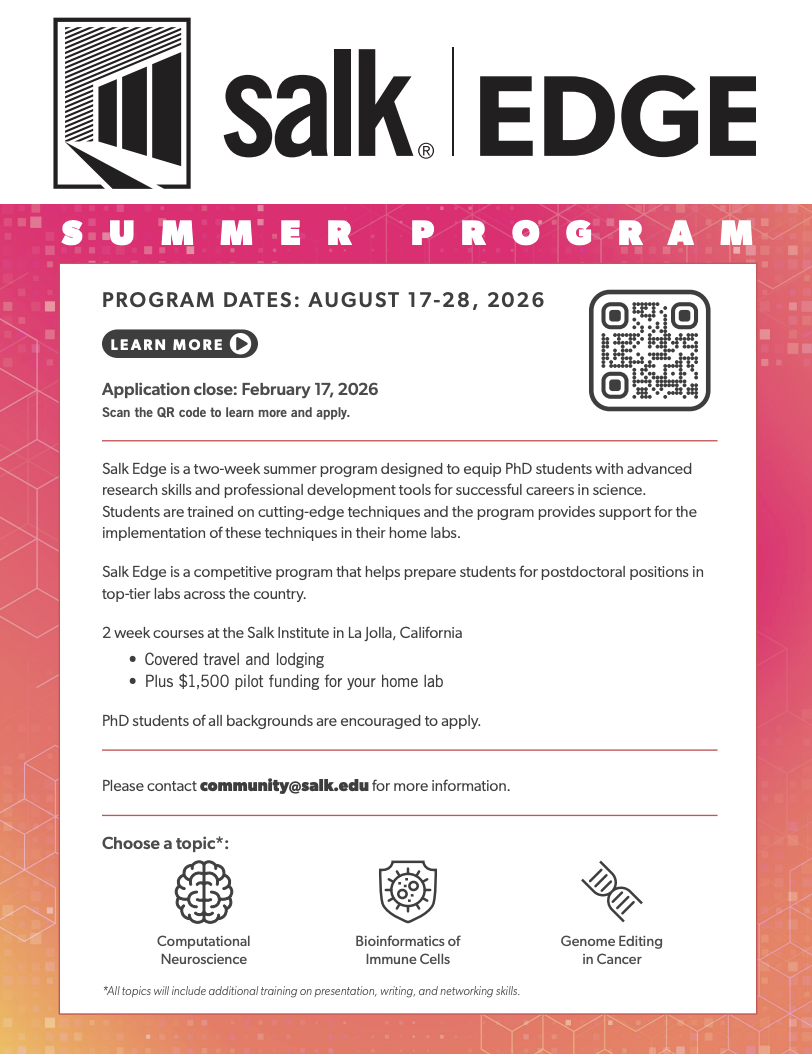 2) Salk Edge is open to earlier career PhD students (years 2-4) who are looking to enhance their training. This two-week, technique-intensive summer initiative is designed to equip PhD students with advanced research skills and professional development tools for successful careers in science.LEARN MORE AND APPLY Application deadline: March 1
