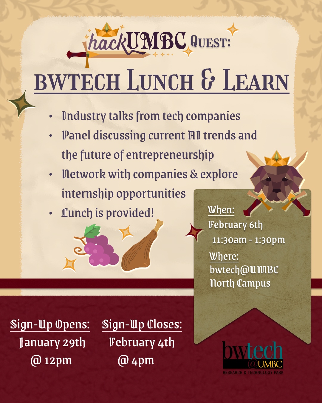 Come join hackUMBC to visit bwtech on February 6th, 2026 from 11:30am to 1:30pm!
