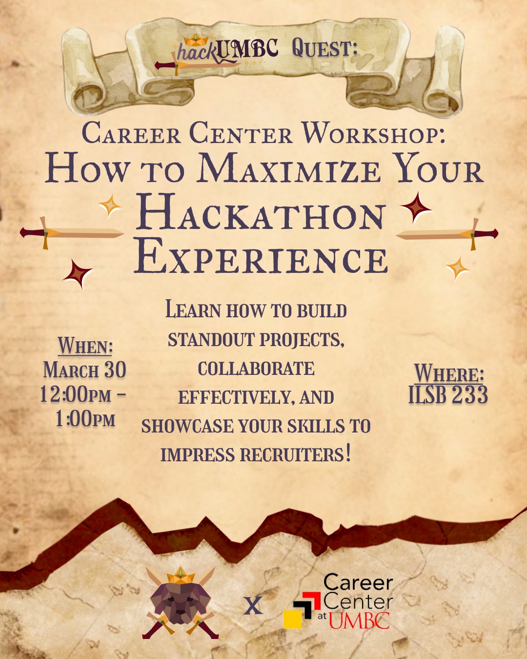 Join HackUMBC and the Career Center at UMBC for a workshop designed to help you level up your hackathon game! Learn how to build standout projects, collaborate effectively, and showcase your skills to impress recruiters!