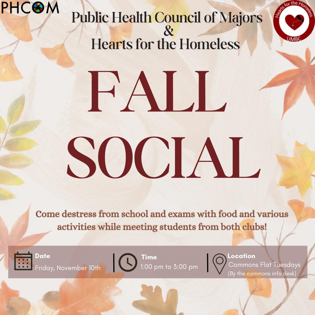 This Friday PHCOM and Hearts for the Homeless is hosting a Fall-themed social event! There will be Pizza, candy, and games. Come have a fun time with us in Flat Tuesdays Nov. 10 from 1pm- 3pm