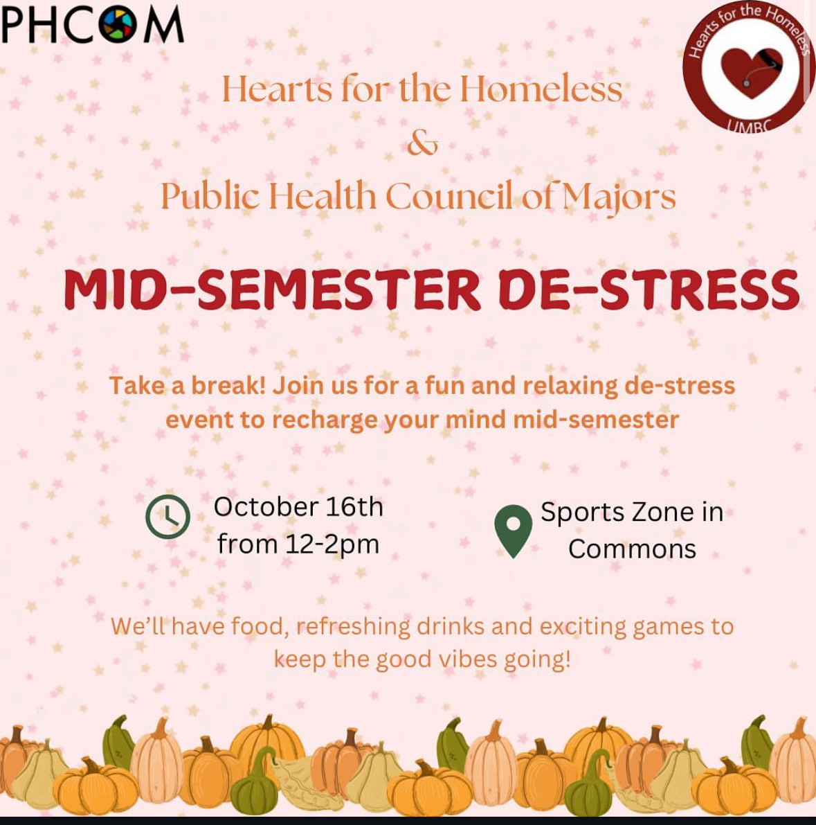 Join us for a fun destress event with H4H. Hit pause on the studying and destress with us! Enjoy food, drinks, and fun games to recharge and refresh your mind! From 12-2 pm at the Sports Zone in Commons