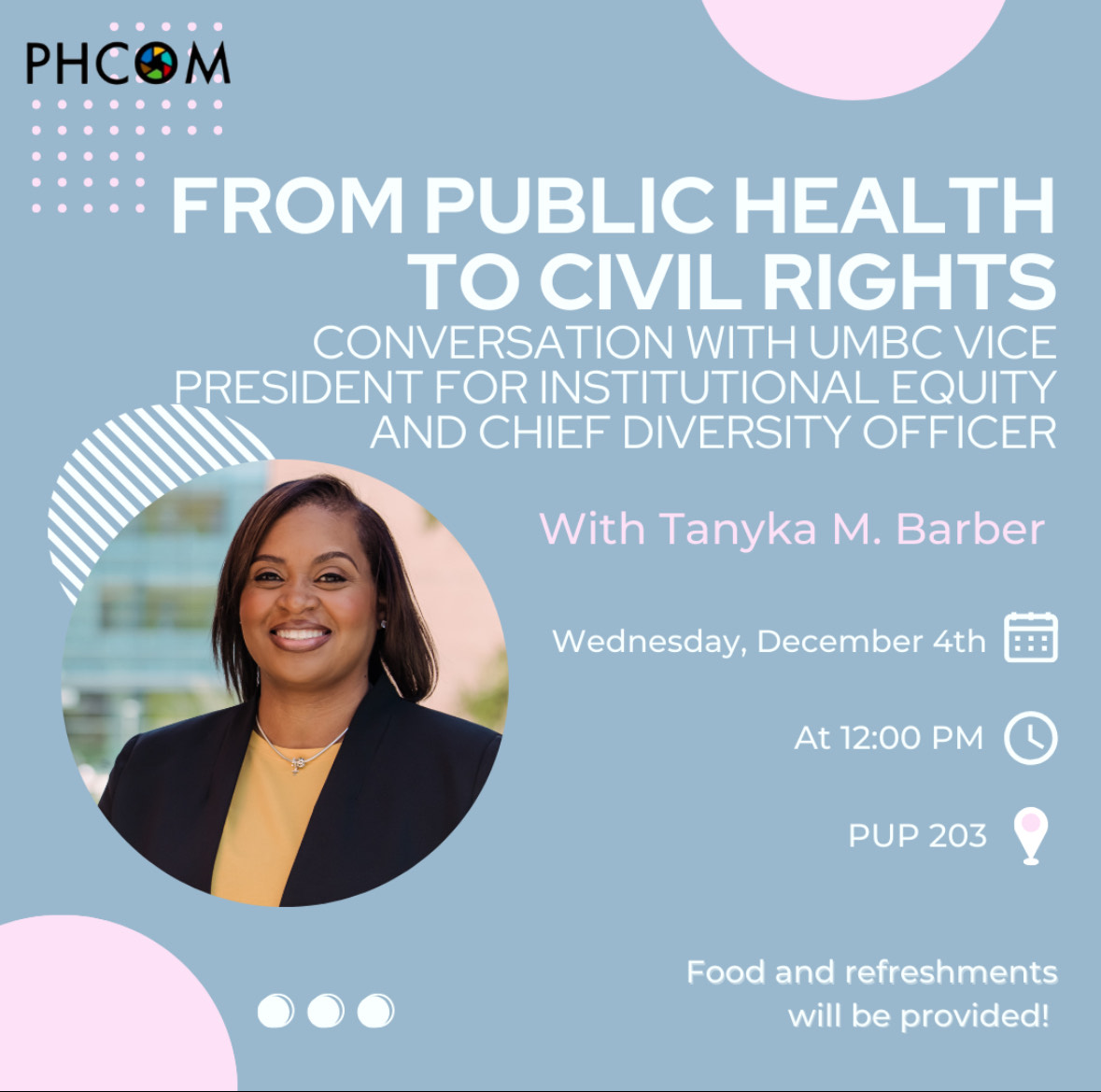 Please join us to talk with Tanyka M. Barber, UMBC Vice President for Institutional Equity and Chief Diversity Officer. The event is on Wednesday, December 4th from 12 - 1 pm at the PUP 203! Food and refreshments will be provided!