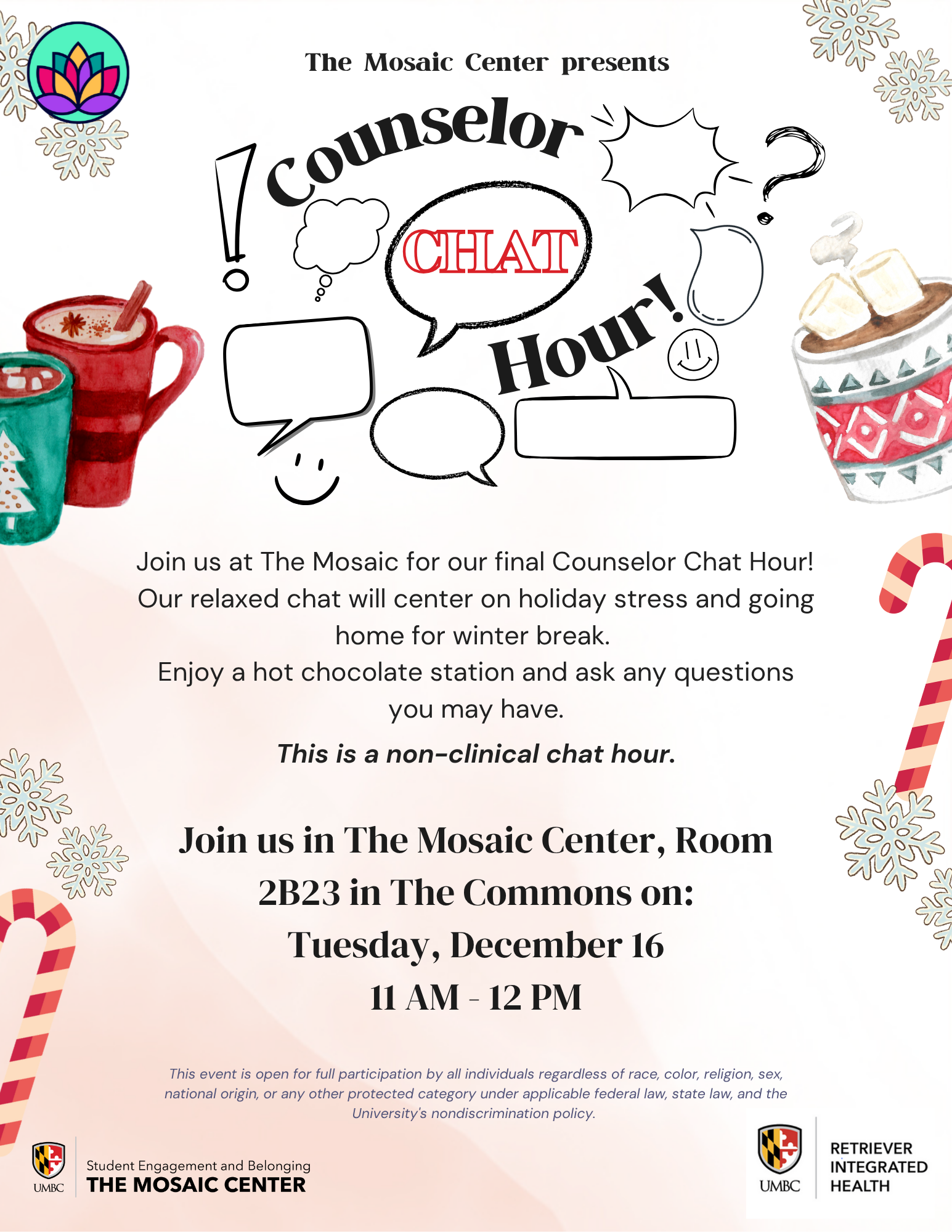 Take a breather before the semester wraps up and drop by our final Counselor Chat Hour at The Mosaic Center!