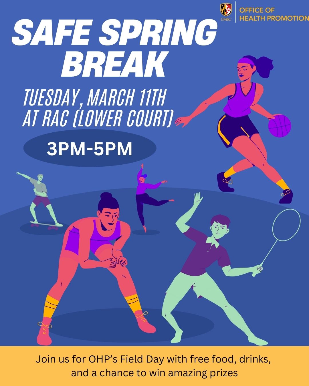 The Office of Health Promotion office will close today, Tuesday, March 11th, at 3 pm for our Safe Spring Break Event. Join us at the RAC Lower Courts 1 and 2 for field day activities and ways to practice safe and healthy behaviors for Spring Break.