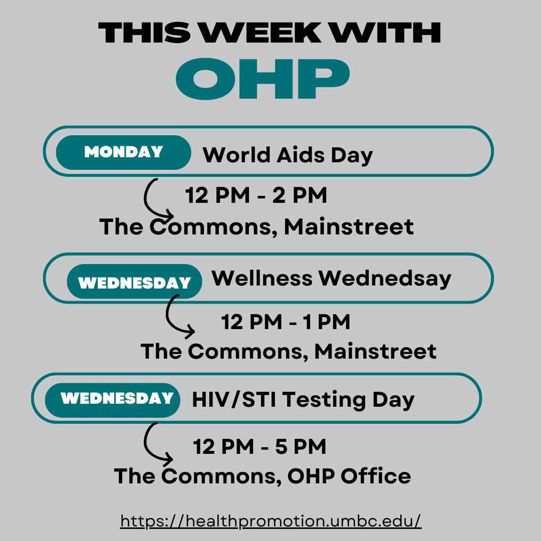 To continue honoring World Aids Day, the Baltimore County Health Department will be in the OHP office space providing free, anonymous, and rapid HIV/STI testing. No insurance and no student ID needed.