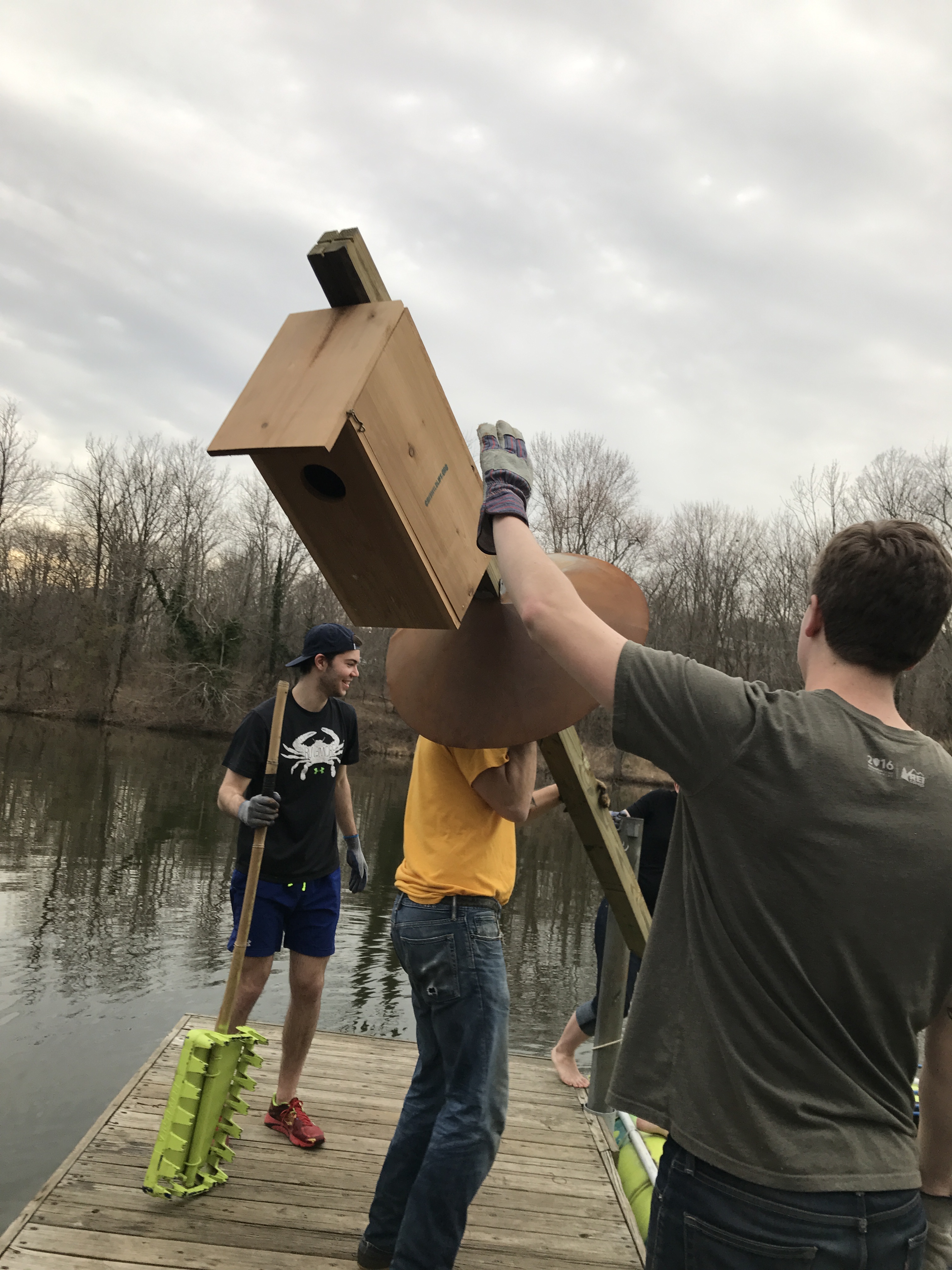 The HRG team puts up a new wood duck post in CERA Pond...