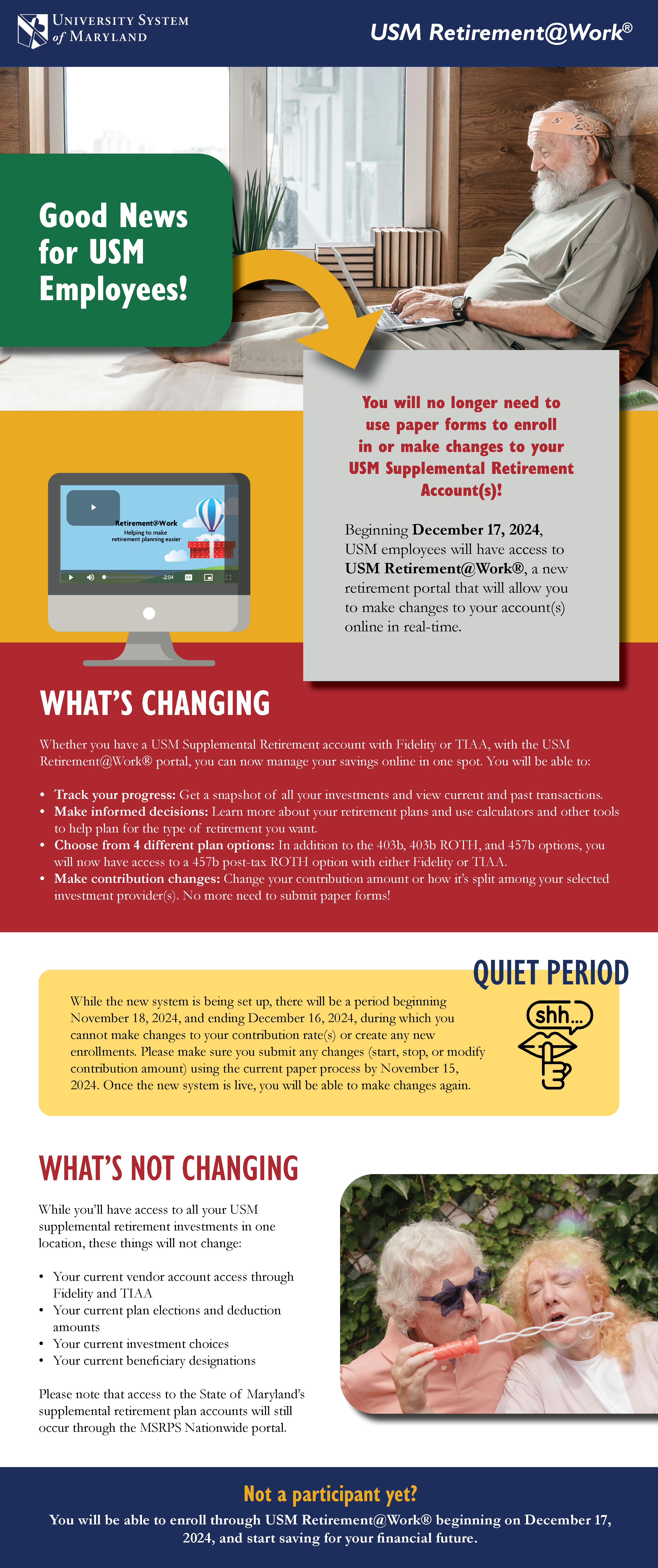 Please email hrbenefits@umbc.edu or visit the HRSTM Supplemental Retirement Account website for the most up-to-date information, including the 2025 Contribution limits memo and link to the USM Retirement@Work website on December 17th when it is live.
