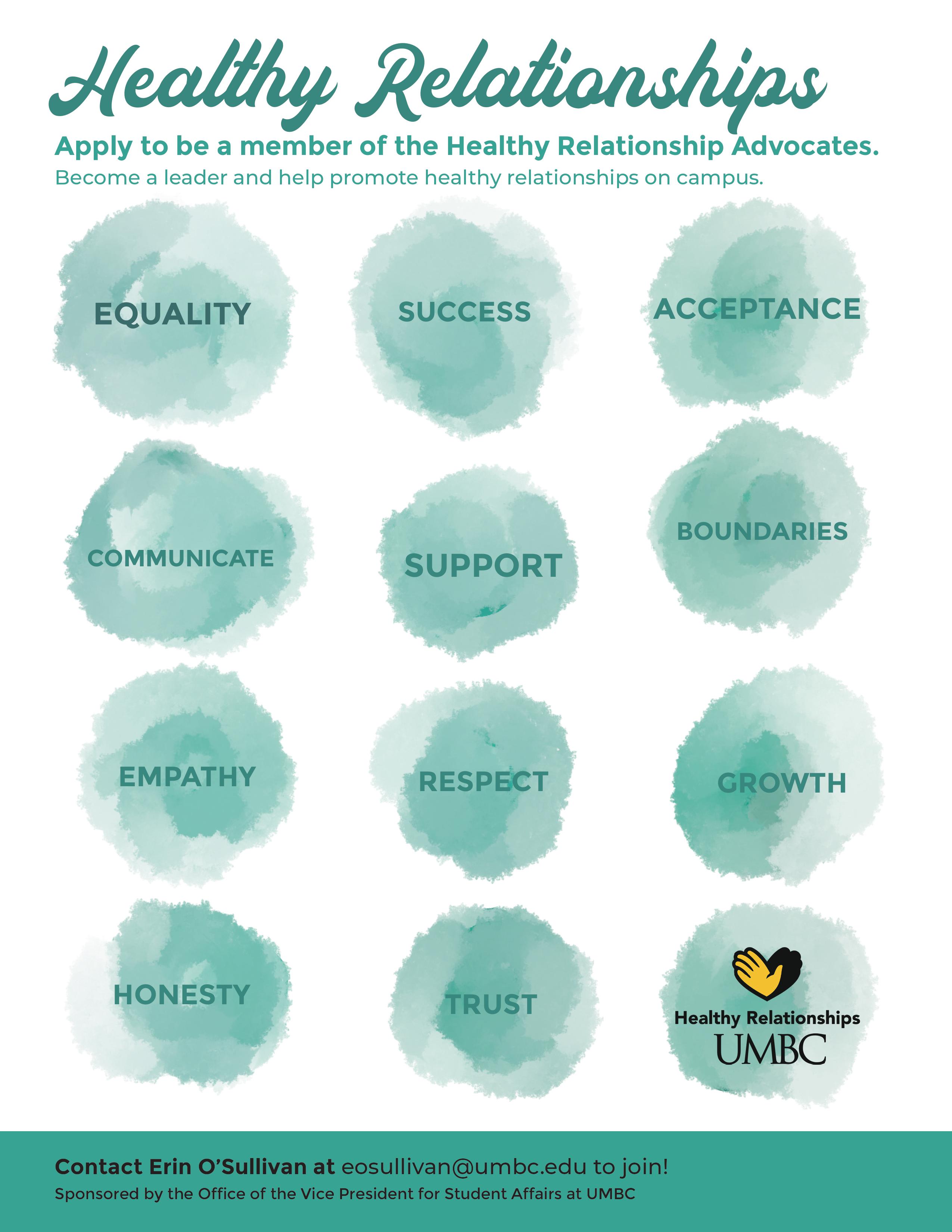 Interested in joining a group on campus while learning about healthy relationships? Contact Erin O'Sullivan at eosullivan@umbc.edu for more information!