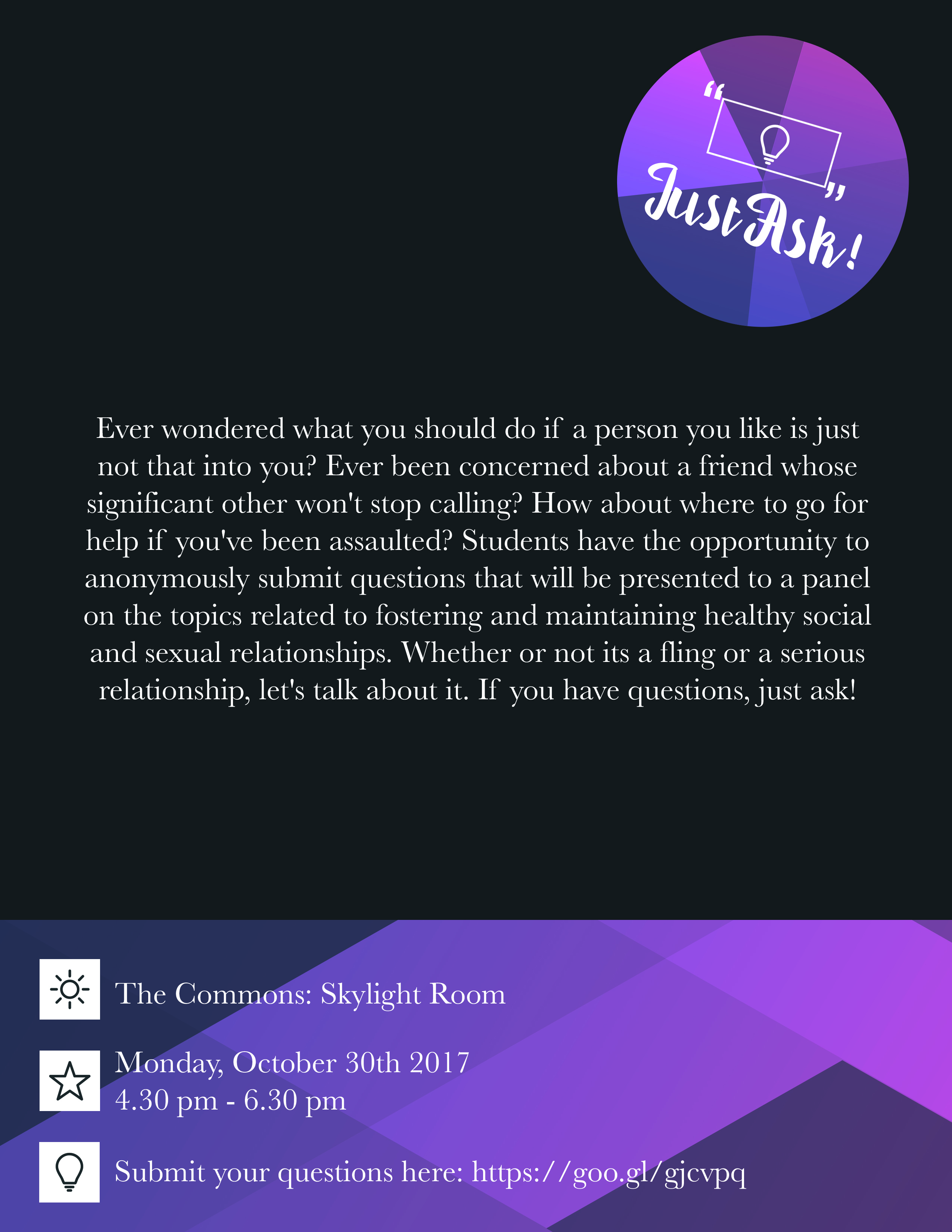 Ever wondered what you should do if a person you like is just not that into you? Ever been concerned about a friend whose significant other won't stop calling? How about where to go for help if you've been assaulted? Students have the opportunity to anonymously submit questions that will be presented to a panel on the topics related to fostering and maintaining healthy social and sexual relationships. Whether or not it's a fling or a serious relationship, let's talk about it. If you have questions, just ask!