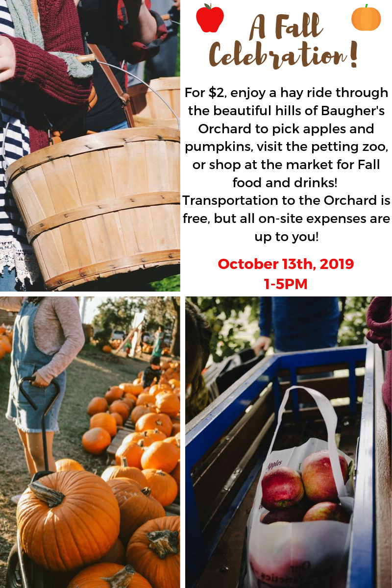 For $2, enjoy a hay ride through the beautiful rolling hills of Baugher's Orchard to pick apples and pumpkins, make a new friend at the petting zoo, or shop at the market for Fall favorites like apple cider and pumpkin pie! Pickup is at the Commons Circle. Transportation to the Orchard is free, but all on-site expenses are up to you!