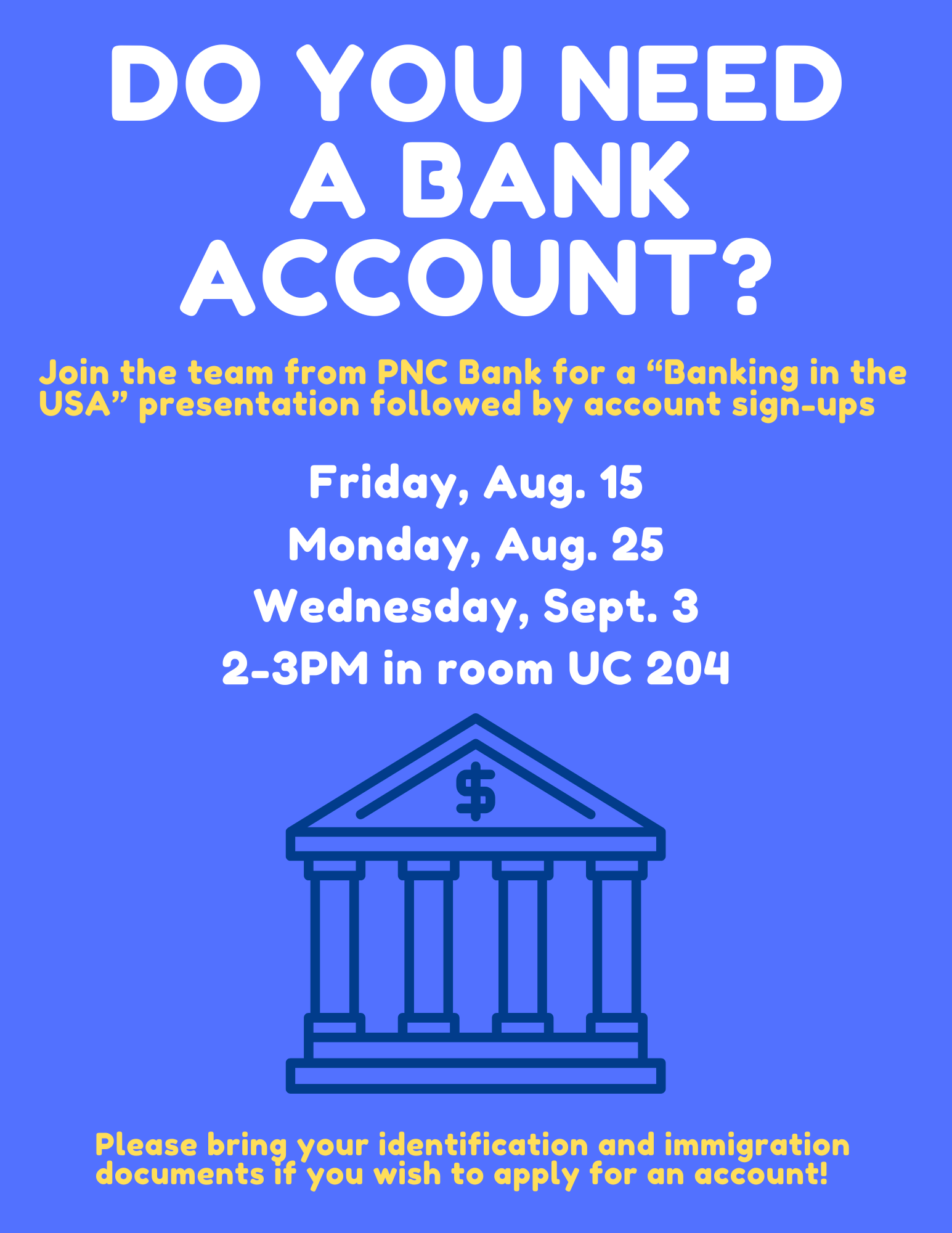 ***If you are going to apply for a bank account, please bring your I-20, passport, and other documents with you to the event***