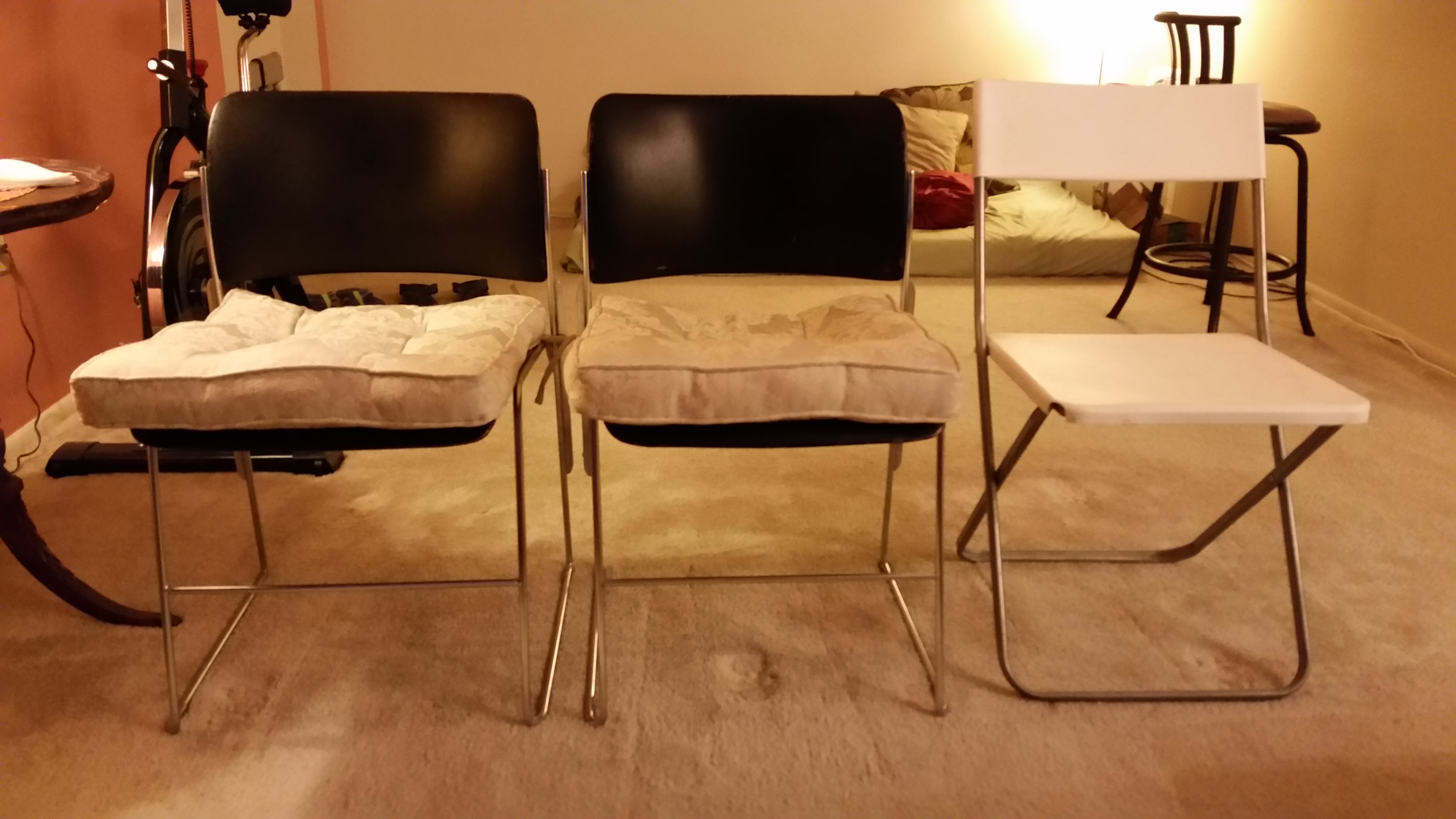 I have two metal chairs with comfy cushions and one foldable plastic chair which I am selling for the following prices: