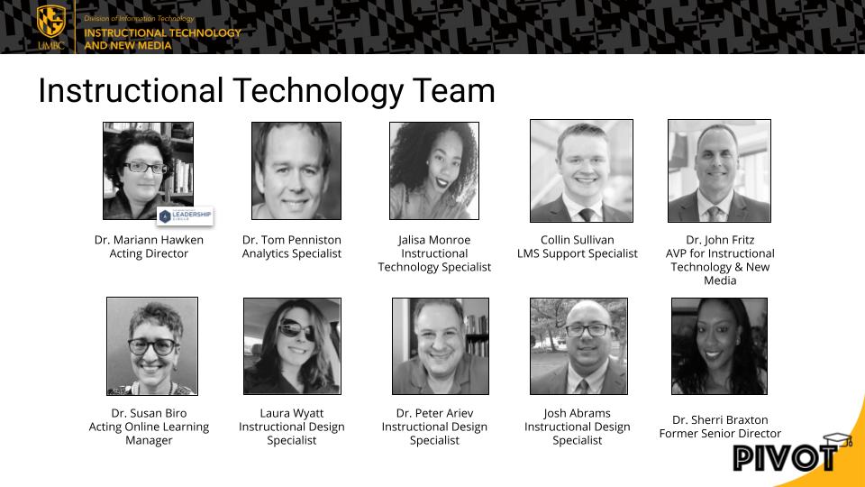 The Online Learning Consortium announced that UMBC's Instructional Technology team has earned an Effective Practice Award for its Planning Instructional Variety for Online Teaching (PIVOT) program. Led by Dr. Mariann Hawken, representatives from the Instructional Technology team will receive the award at the OLC Accelerate conference in Washington, D.C.