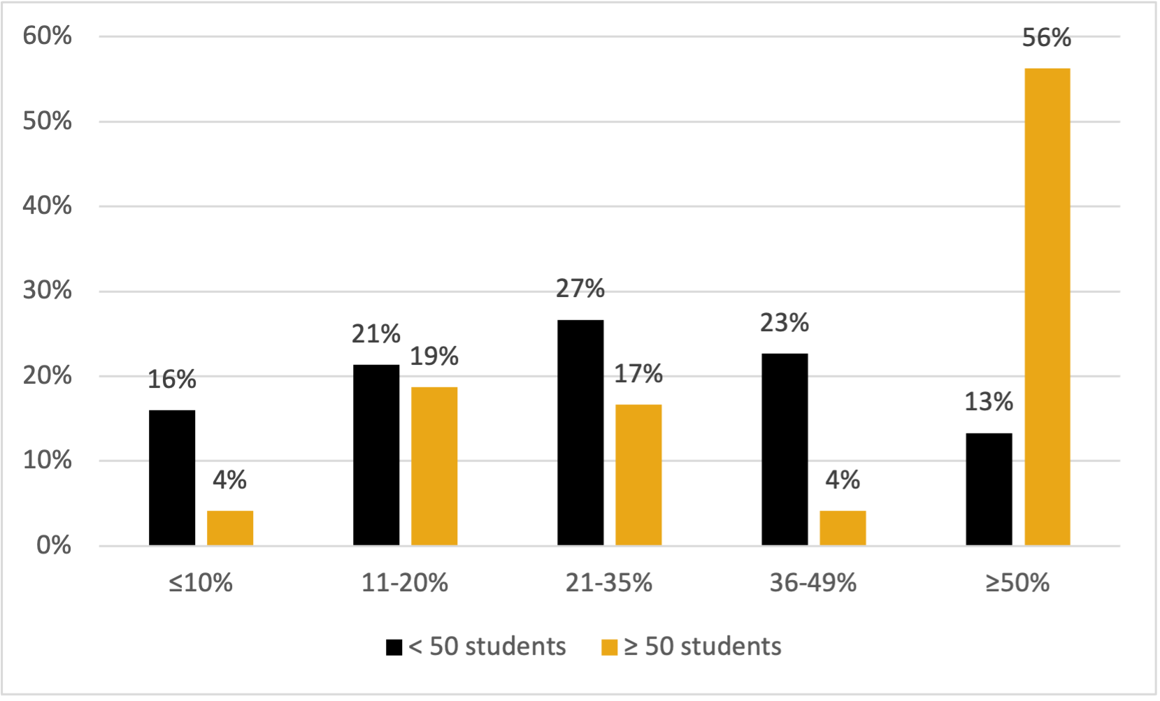 The majority of respondents (59%) taught classes of 50 or fewer students, and about one in five (19%) taught classes with more than 100 students. Additionally, of those instructors teaching courses with at least half of their students' final grades determined by high-stakes tests, 72% agreed or strongly agreed that "Academic integrity on high-stake assessments is a major concern in my course(s)." That same level of sentiment is shared with less than half (49%) of instructors with grading schemas that are not as dependent on high-stakes testing.