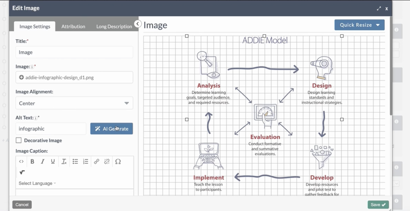 Image: Example of CourseArc image insertion with AI text and long description generator tool
