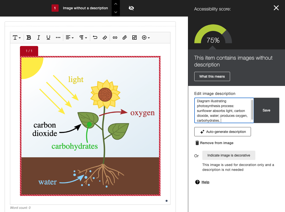 The newest enhancement to Ally’s AI-powered Alt Text Assistant brings advanced support for describing complex images -- including charts, diagrams, graphs, and even handwritten notes. Instructors can continue using the same one-click workflow to generate alt text for images embedded in Blackboard-created content. This upgrade is especially valuable for STEM, social science, or data-rich courses where traditional alt text tools fall short, helping faculty meet accessibility standards while saving time and improving the learning experience for all students.