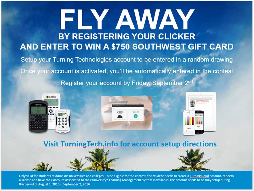 Turning Technologies is running a contest for students who activate their Turning Accounts between August 1, 2016 and September 2, 2016. Students who activate their accounts during this time will be entered into a drawing for a $750 Southwest Airlines gift card. Please see attached flyer for more information. Good luck!