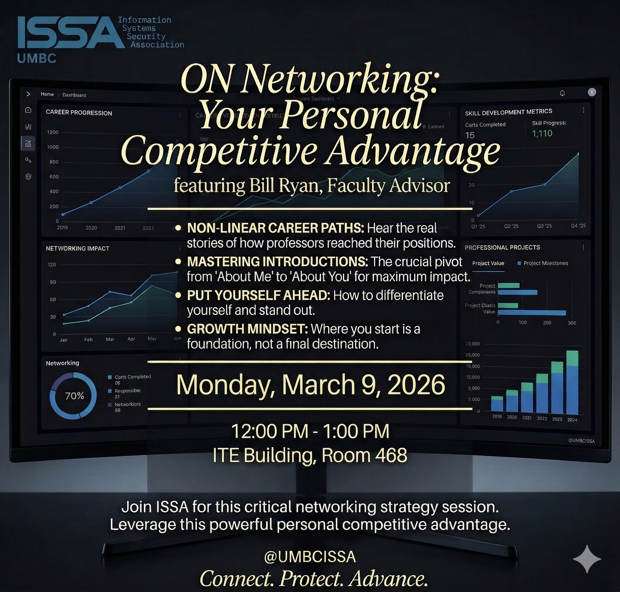 Join ISSA for a session on leveraging networking as your primary competitive tool. Faculty advisor Bill Ryan will share insights on navigating the professional landscape and standing out in a crowded field.