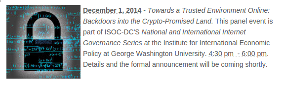 Towards a Trusted Environment Online: Backdoors into the Crypto-Promised Land. This panel event is part of ISOC-DC'S National and International Internet Governance Series at the Institute for International Economic Policy at George Washington University. 4:30 pmĀ - 6:00 pm. Details and the formal announcement will be coming shortly.