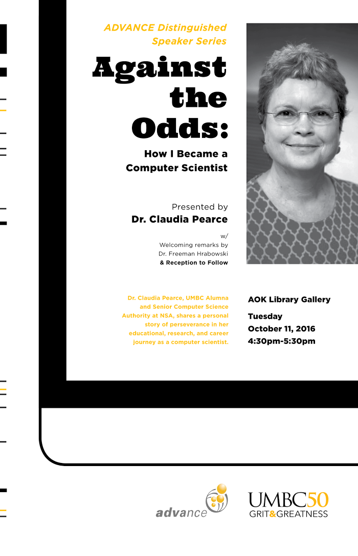 Dr. Pearce is a UMBC Alumna in Computer Science and currently the Senior Computer Authority at NSA. President Hrabowski will offer welcoming remarks with a reception to follow.