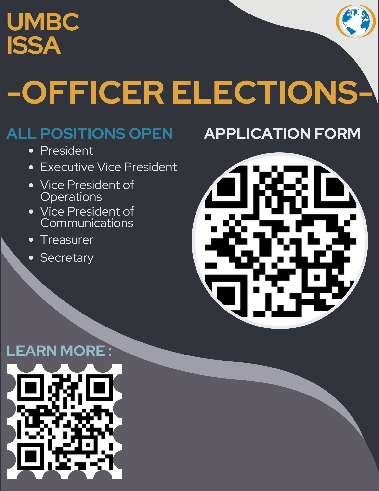 We are hosting our annual elections from April 15th to April 26th! If you are interested in running to become an Officer or would like to nominate a member for the running, please fill out the application to be registered into the ballot. This form is due Friday, April 26th at 11:59PM. We will announce the new eboard on May 1st!
