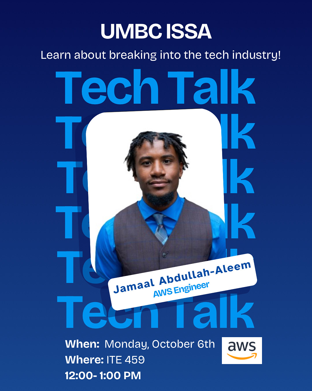 Join us for our General Body Meeting on Monday, October 6th, from 12 p.m. to 1 p.m in ITE 459. Our guest speaker Jamaal Abdullah-Aleem an AWS Engineer, will be discussing how to break into the tech industry! Enjoy some pizza, bring a friend and hear about Jamaal's journey!