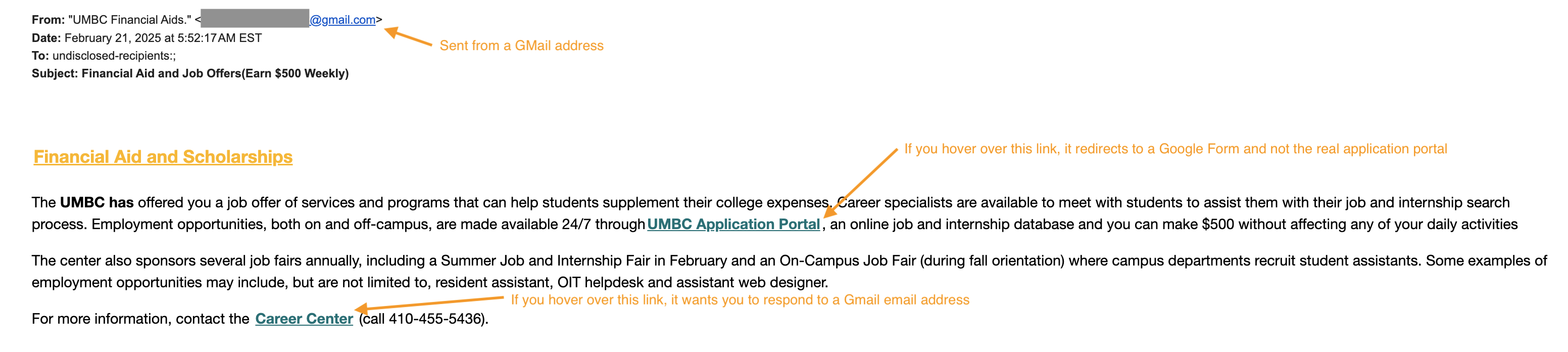 - The email claimed to be from the Career Center but was sent from a personal Gmail address (not @umbc.edu).
