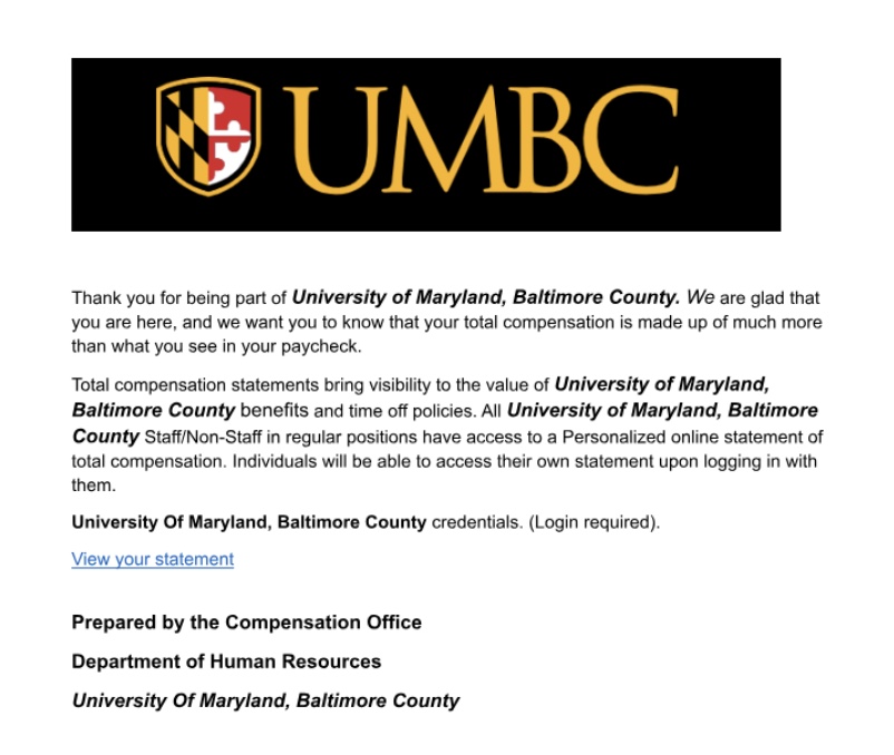 DoIT is aware of an ongoing phishing campaign targeting faculty and staff. The message arrives in users' inboxes appearing to be a document shared from Google. Within the document there is a link that masquerades as personalized compensation statement, but is actually a form attempting to collect your myUMBC credentials and DUO codes.