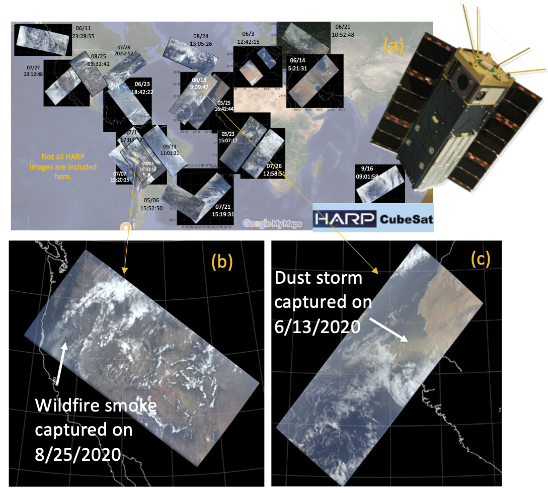 Figure caption: (a) Gallery of HARP captured images in 2020 across the globe. Highlighted in panels (b) and (c) are scenes for wildfire smoke plumes over the Western U.S. and Saharan dust storm plums over northern Atlantic, respectively.