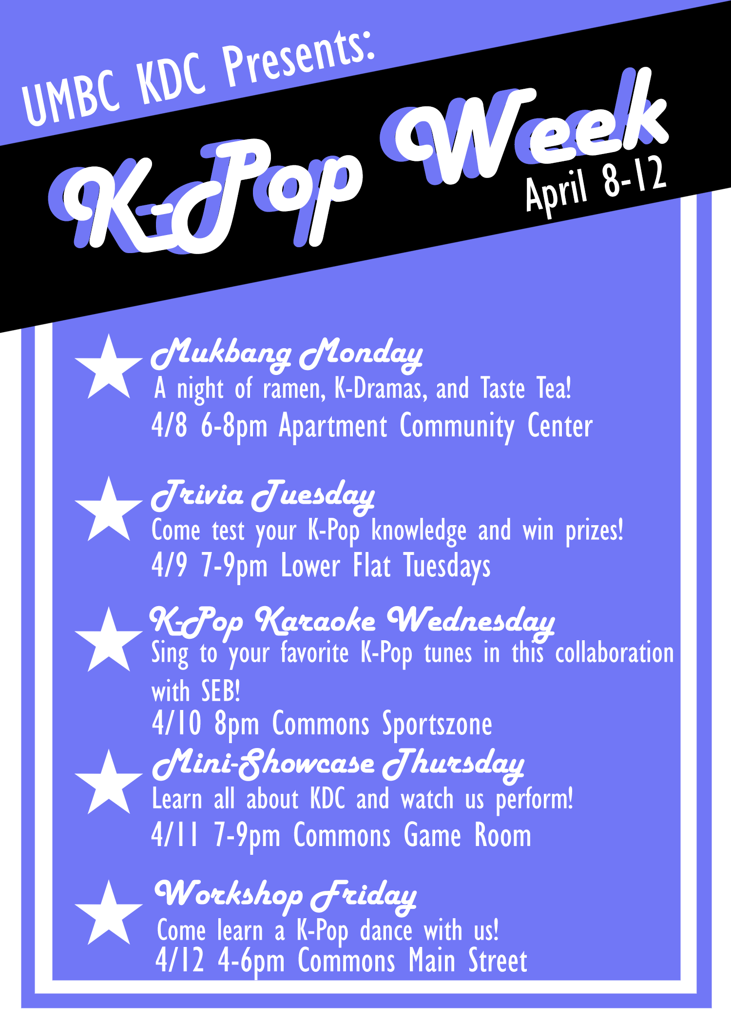 How much do you know about K-Pop? Bring your friends and test your knowledge! Prizes will be given out to the groups/individuals that know the most. There will also be snacks, so come check it out.
