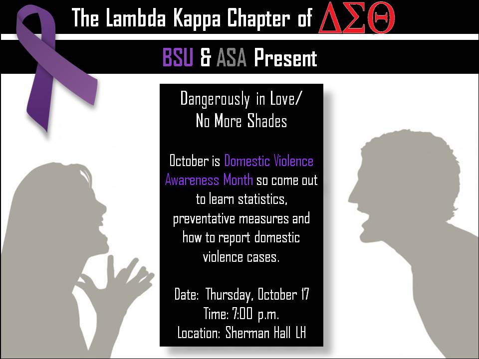 In honor of Domestic Violence Awareness Month, the Lambda Kappa Chapter of Delta Sigma Theta Sorority, Incorporated with be holding a program with the Black Student Union and the African Student Association. We want to inform the students of UMBC of the statistics of domestic violence, ways to spot it and who to contact. There will also be a presentation by a Peer Health Educator. Come join us on Thursday, October 17th in the Sherman Hall Lecture Hall!
