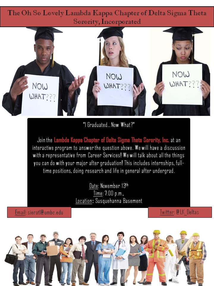 Join the Oh So Lovely Lambda Kappa Chapter of Delta Sigma Theta Sorority, Incorporated at an interactive program to answer the question, "I graduated...now what?" We will have a discussion with a representative from Career Services! We will talk about all of the things you can do with your major after graduation! This includes, internships, full-time positions, doing research and life in general after undergrad.