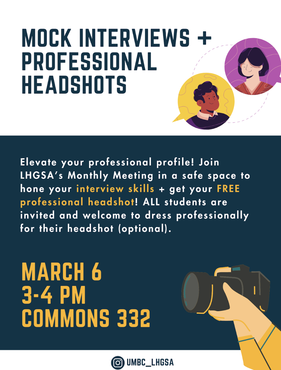 Our next event is aimed at elevating your professional profile! Join LHGSA's next Monthly Meeting in a safe space to hone your interview skills + get your FREE professional headshot! ALL students are invited and welcome to dress professionally for their headshot (optional).