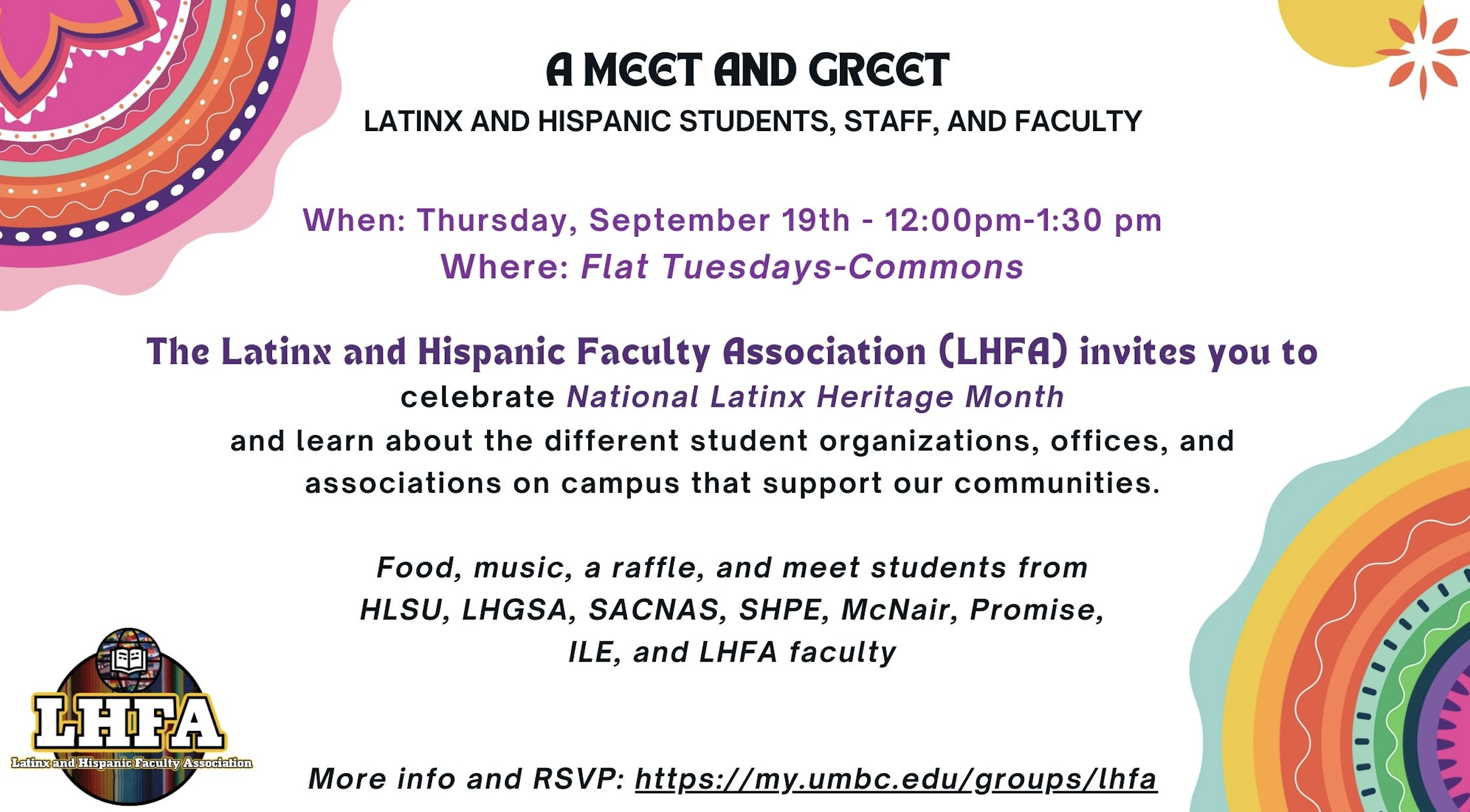 The Latinx and Hispanic Faculty Association (LHFA) invites you to our annual meet and greet to celebrate National Latinx Heritage Month and learn about the different student organizations, offices, and associations on campus that support our communities.