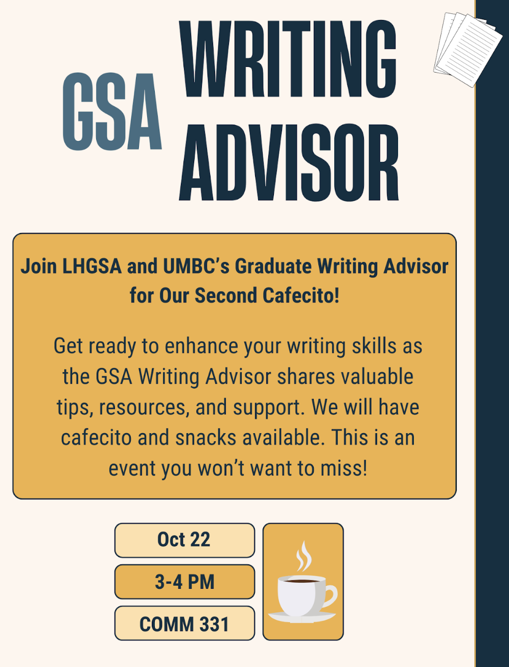 LHGSA's meeting is TODAY Tuesday, October 22nd from 3-4PM. This will be a time to socialize and also hear from a graduate school writing center advisor who will be sharing tips and trick for reading and writing as a graduate student. Location is COMM 331.