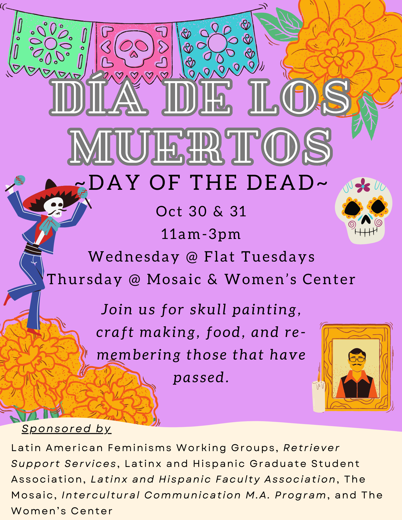 This is day 1 of 2 that we will be celebrating Day of the Dead. Traditionally celebrated on November 1st and 2nd, we will celebrate on the 30th and 31st to better accommodate staff and students that wish to participate. The Gathering Space is also open on Friday (November 1st) to support students who may want a more solemn space to remember.