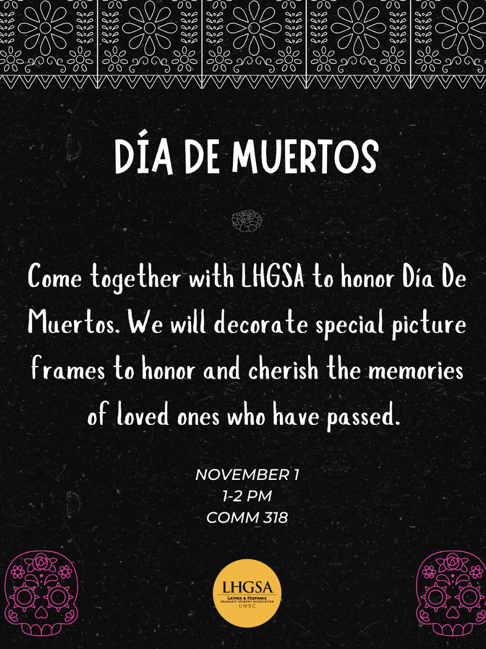 Come together with LHGSA to honor Día De los Muertos. We will decorate special picture frames to honor and cherish the memories of loved ones who have passed. There will be art supplies and food/snacks!