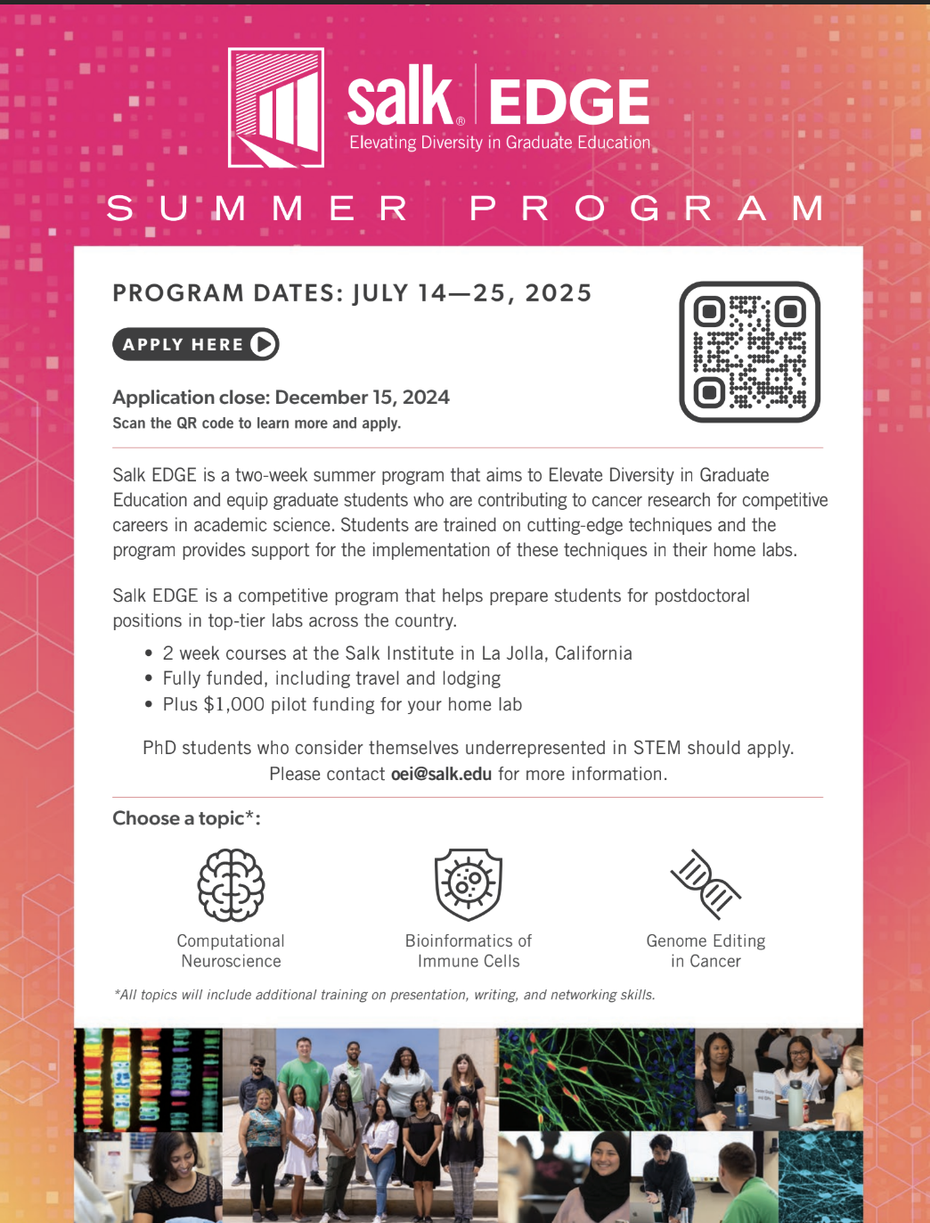 The Salk EDGE summer program aims to Elevate Diversity in Graduate Education. Salk EDGE is an exciting, intensive, 2-week hands-on summer program through which PhD students can train on cutting-edge research techniques. The program also supports the use of these new techniques in the graduate students’ home labs through pilot funding. We would appreciate it if you circulated and let any qualified individuals know about this opportunity.