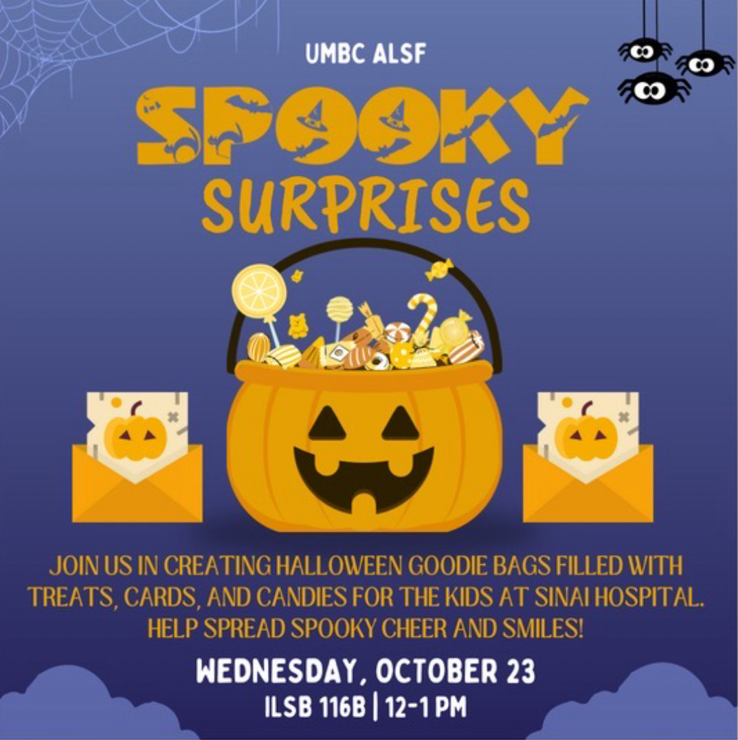 Join UMBC ALSF in creating Halloween goodie bags filled with treats, cards, candies, and toys for kids at the Sinai Hospital. Be part of the spooky surprise and spread joy and happiness this Halloween!!!