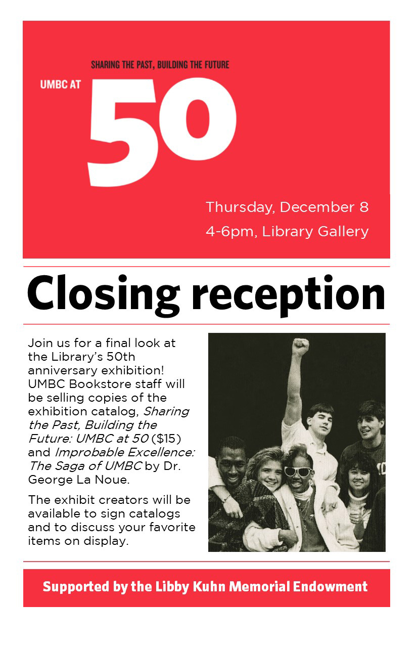 Join us for a final look at the Library's 50th anniversary exhibition! UMBC Bookstore staff will be selling copies of the anniversary catalog ($15) and Improbable Excellence: The Saga of UMBC by Dr. George La Noue.