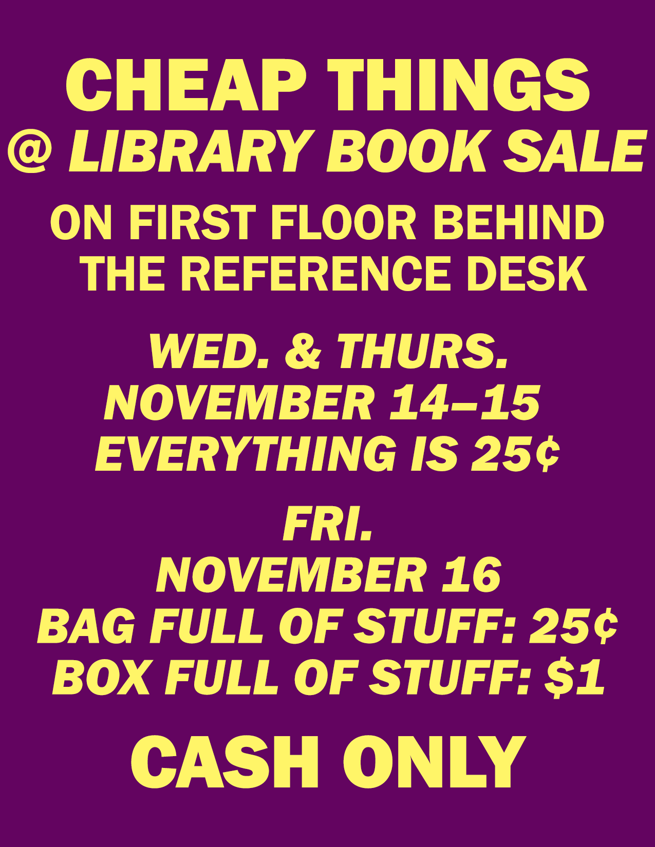 You can find recent and vintage books of all languages, DVDs, CDs, vinyl records, and more! Stop by the library and follow the signs to the space behind the Reference desk near the back elevator.