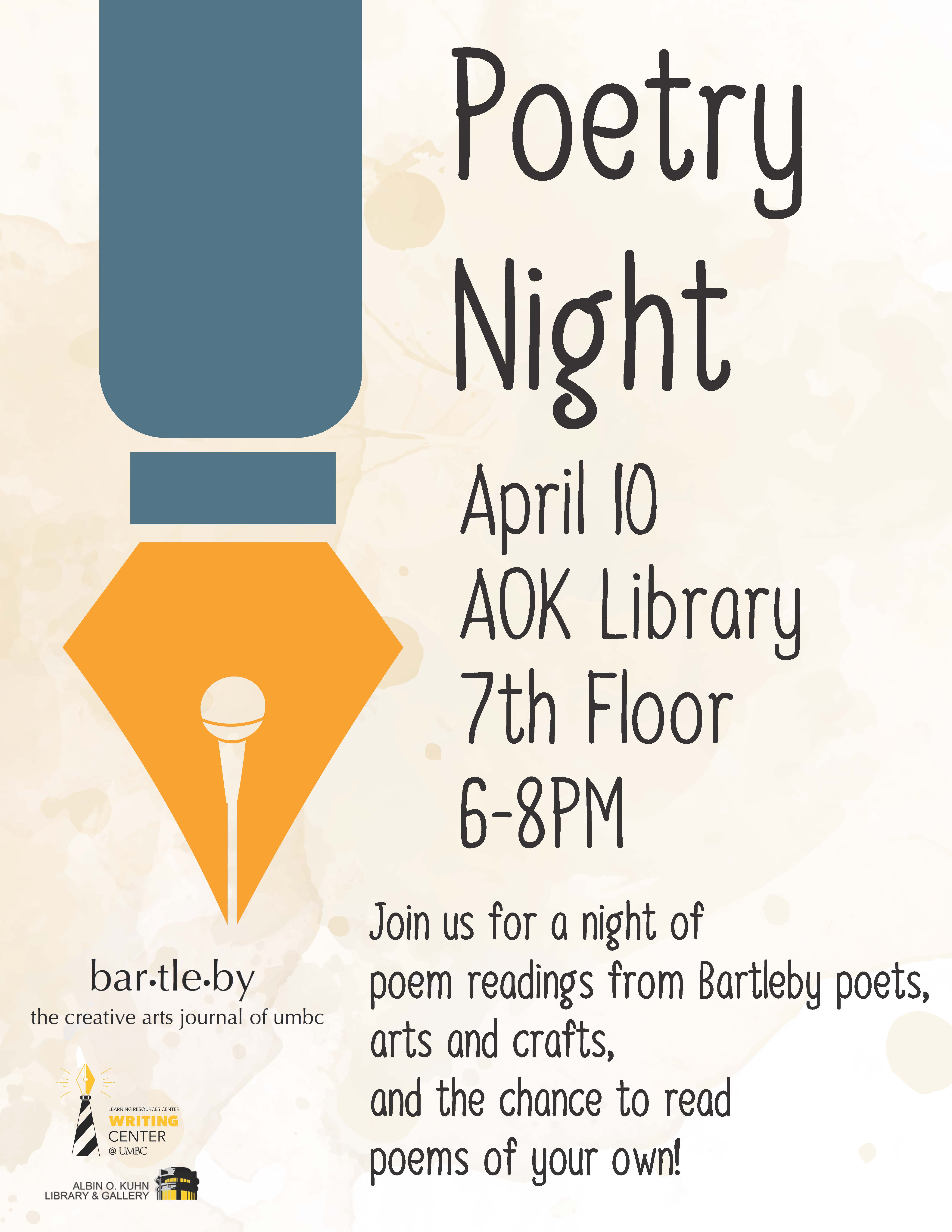 Celebrate National Poetry Month with a night of poetry performances, arts & crafts, and free food. We will feature poem readings from Bartleby poets, followed by an open mic for attendees to read poetry of their own!