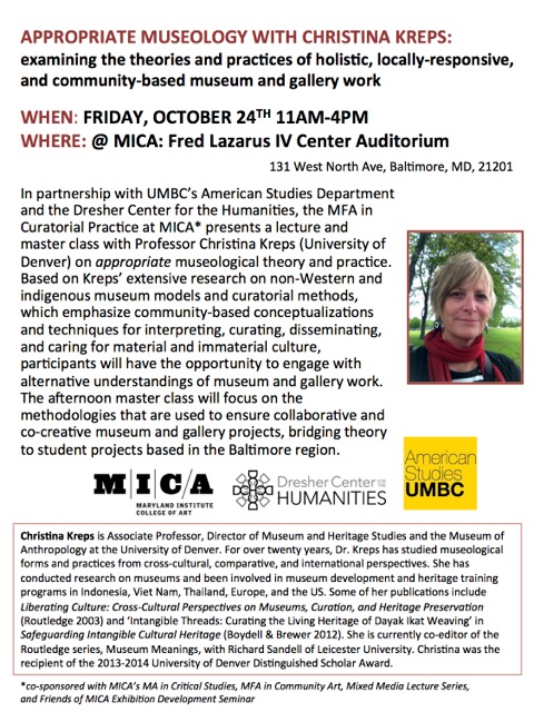 Based on Kreps' extensive research on non-Western and indigenous museum models and curatorial methods, which emphasize community-based conceptualizations and techniques for interpreting, curating, disseminating, and caring for material and immaterial culture, participants will have the opportunity to engage with alternative understandings of museum and gallery work.