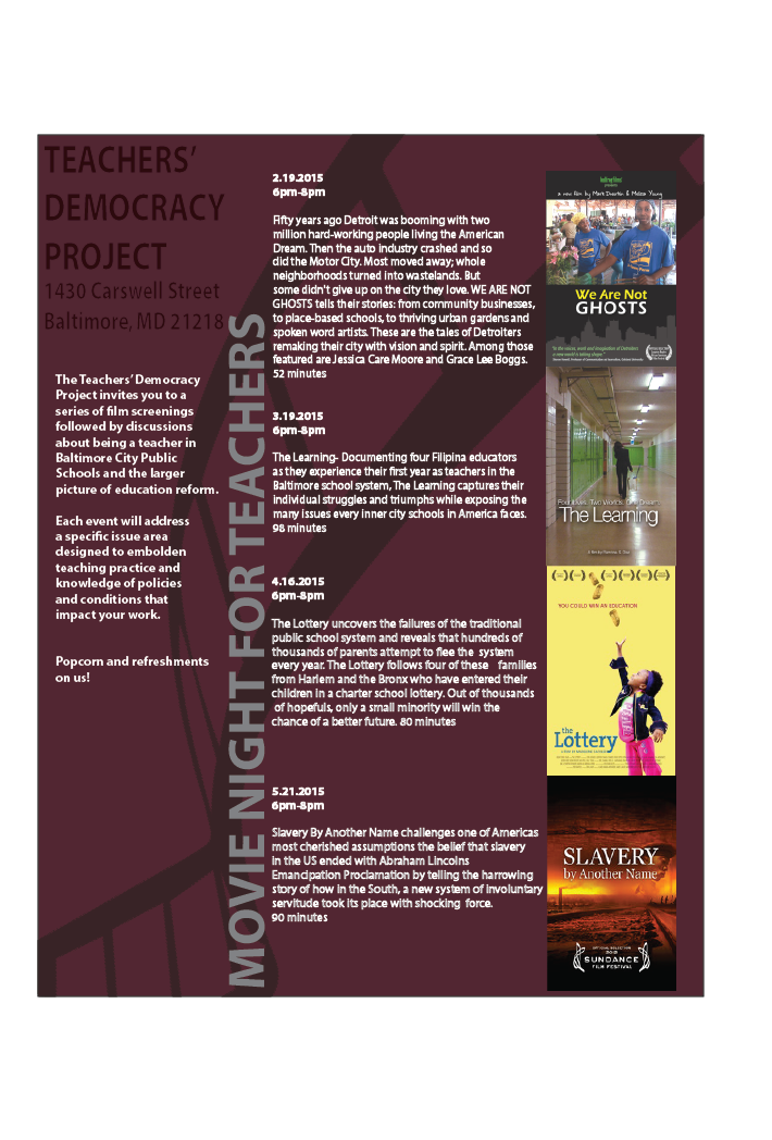 The event is organized by the Teachers' Democracy Project. Please see flyer for more information about the film screenings.