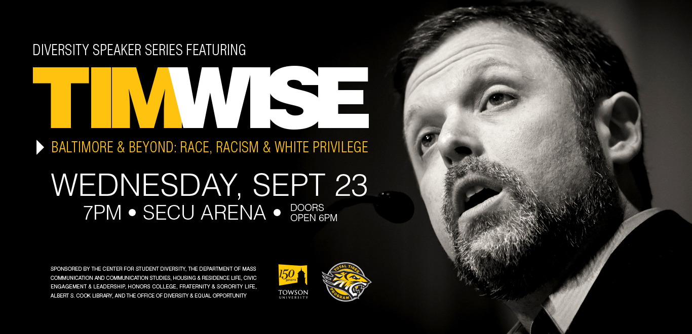 Towson University's Center for Student Diversity invites the public to their Fall 2015 Diversity Speaker, Tim Wise on Wednesday, September 23 at 7pm in Secu Arena (Towson U Campus).