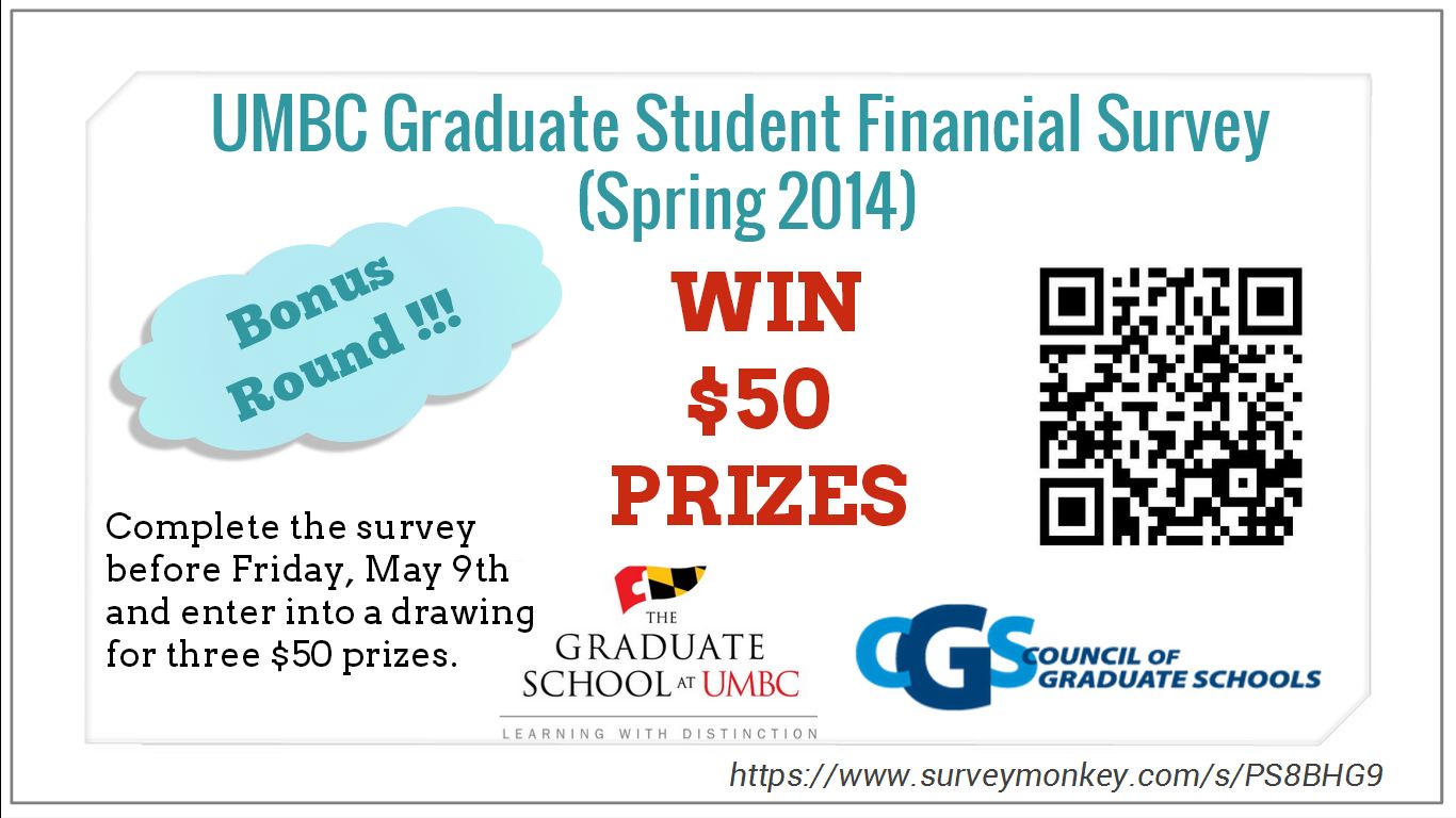The Council of Graduate Schools (CGS) is offering a BONUS ROUND for the "Survey of Financial Standing" for those graduate students who did not complete the survey this past April. There will be three additional prizes of $50 gift cards! *ALL* graduate students from all disciplines are eligible, including both part-time and full-time students.
