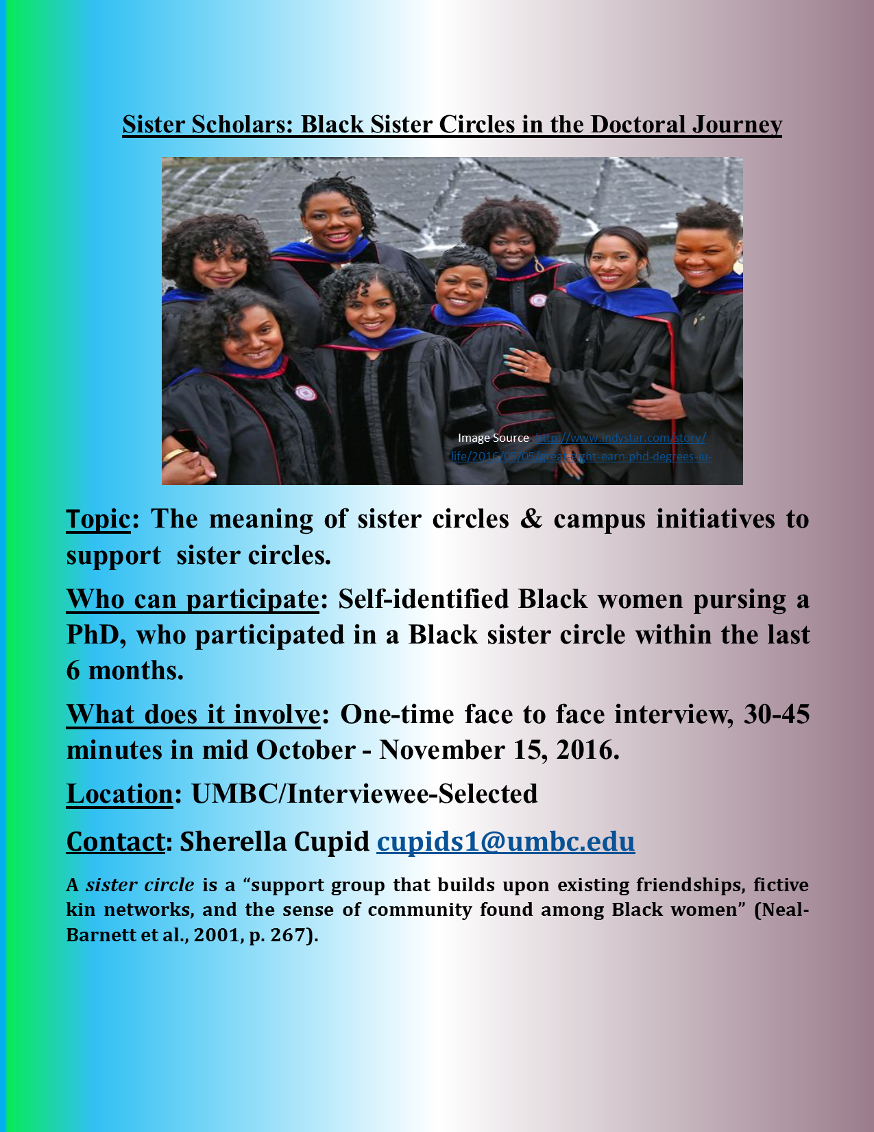A Sister Circle is a "support group that builds upon existing friendships, fictive kin networks, and the sense of community found among Black women (Barnett et. al., 2001, p.267). All self-identified Black women pursing a PhD who participated in a Black Sister Circle within the last 6-months are invited to reach out to Sherella Cupid. Those interested are invited to participate in an interview as a part of a qualitative research course project, Sister Scholars: Black Sister Circles in the Doctoral Journey. This will involve a one-time face to face interview that will last for about 30-45 minutes in mid-October-November 15, 2016. Those selected will be notified of the location on UMBC's campus. If you have any more questions about the Sister Circle please contact Sherella Cupid at cupids1@umbc.edu.